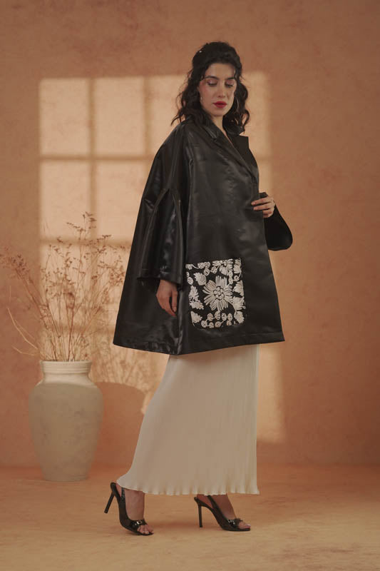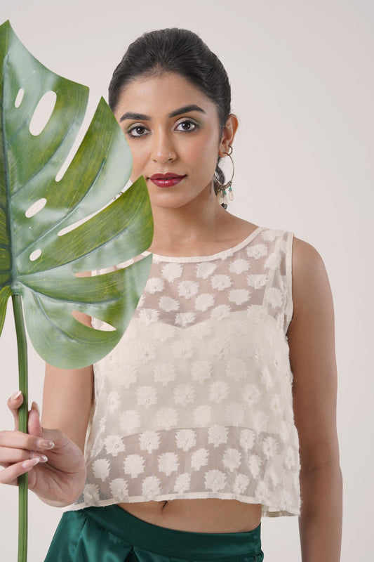 Ivory Sheer Embroidered Crop Top with Emerald Green Satin Pants