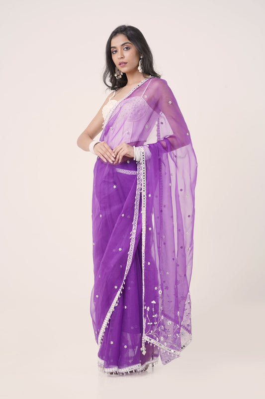 Plum Organza Saree with Hand-Embroidered Pearl Corset Blouse