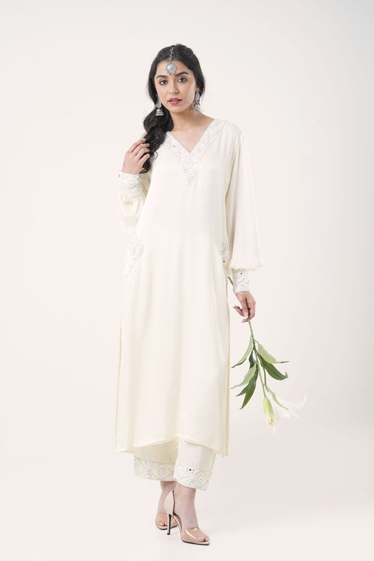 Lucknow Ivory Embroidered Kurta Set with Balloon Sleeves