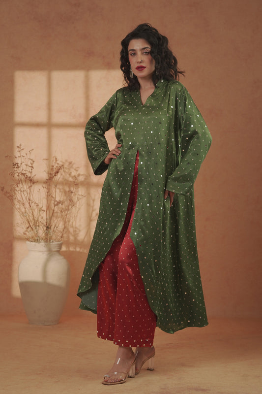 Ivory Sheer Embroidered Crop Top with Emerald Green Satin Pants
