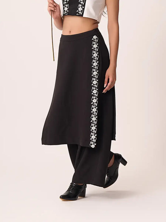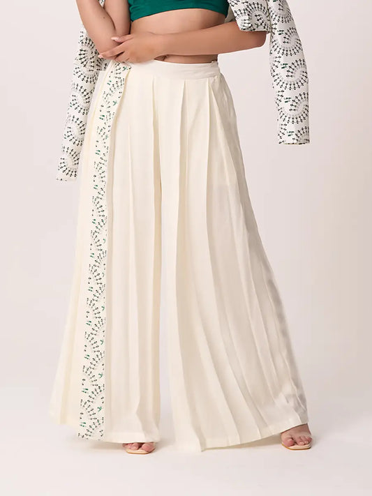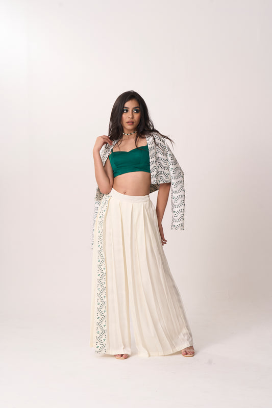 Ivory Sheer Embroidered Crop Top with Emerald Green Satin Pants