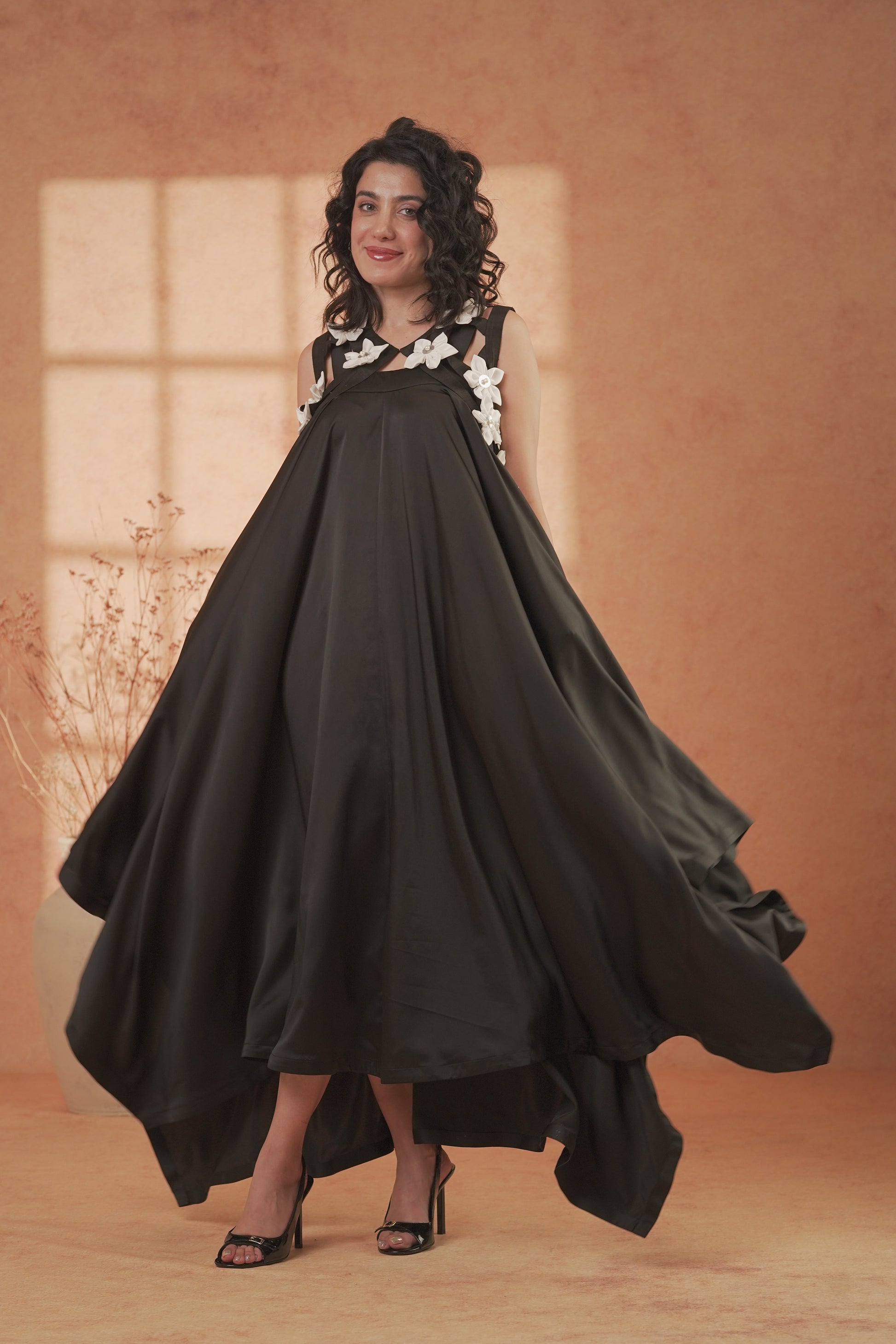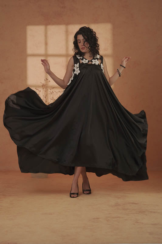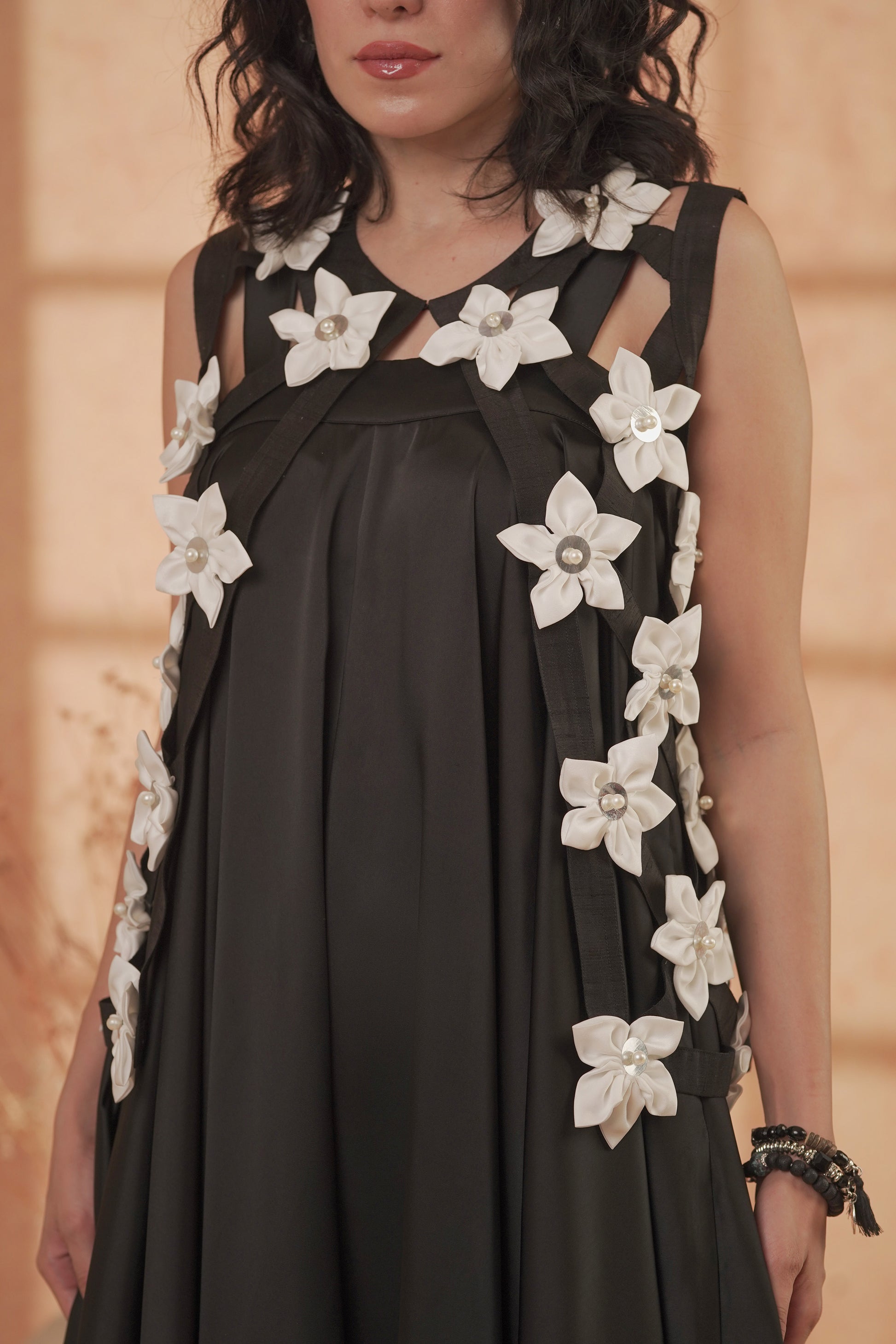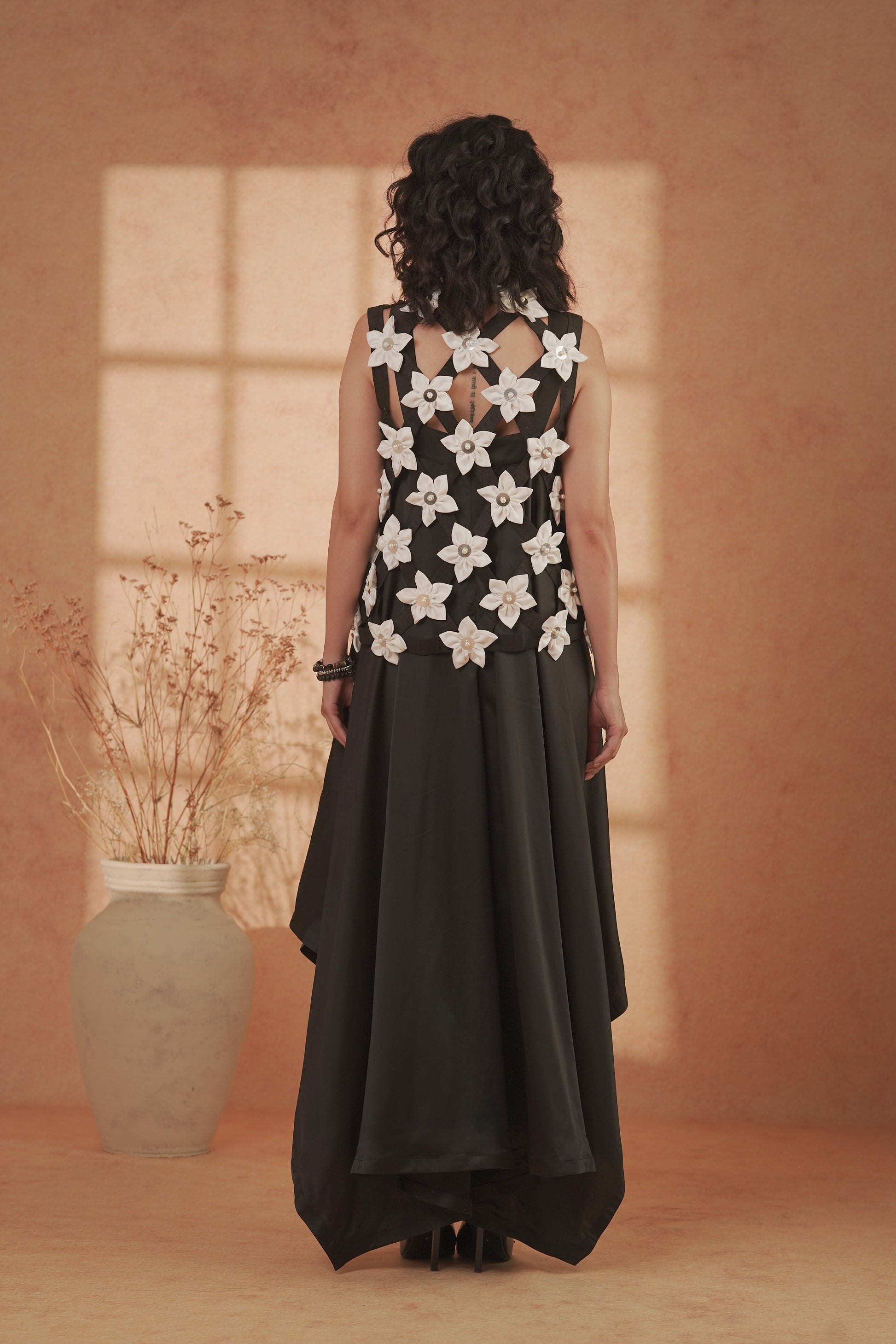 - Jacket: Black Raw Silk with White Crepe floral Beaded cutwork appliqué