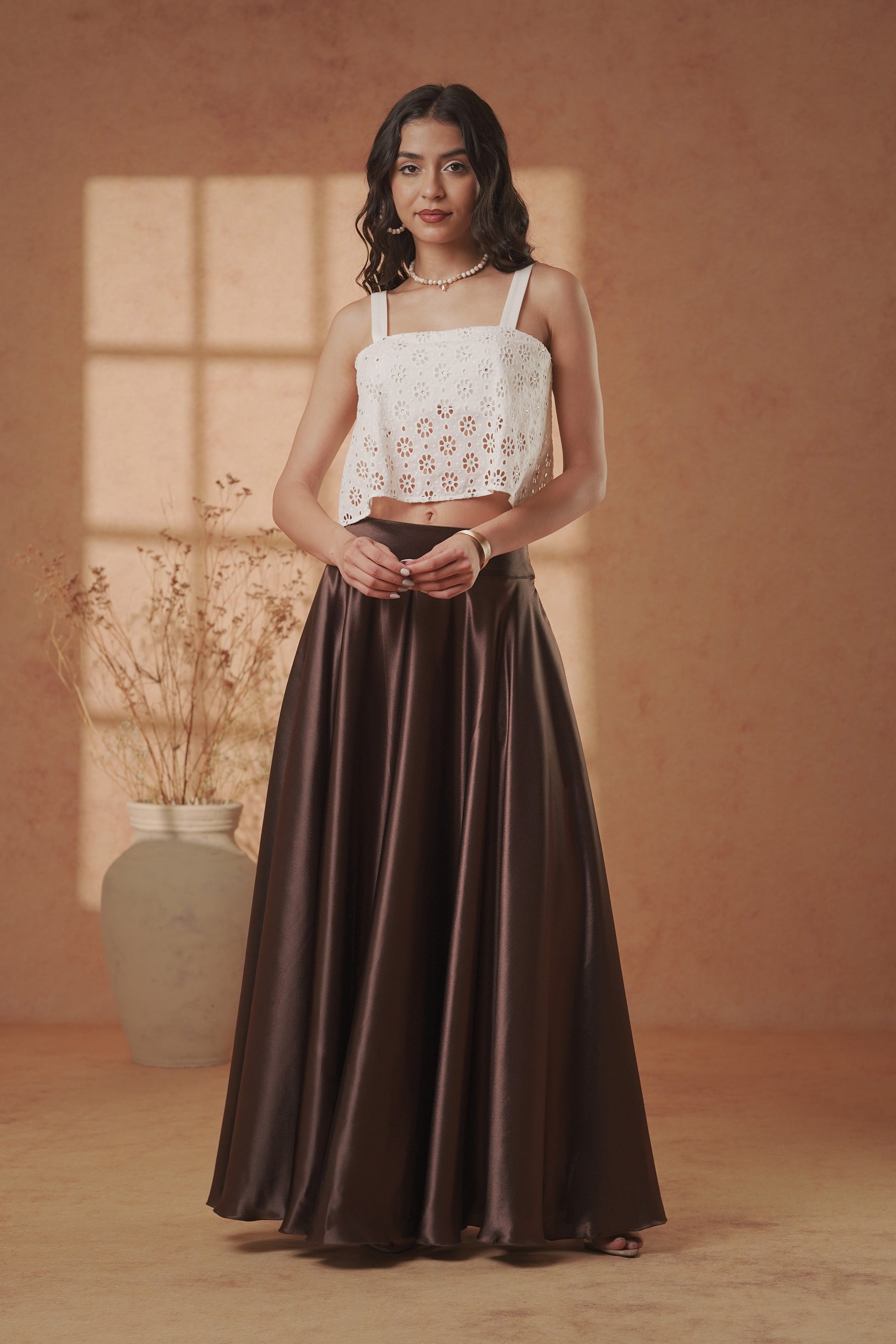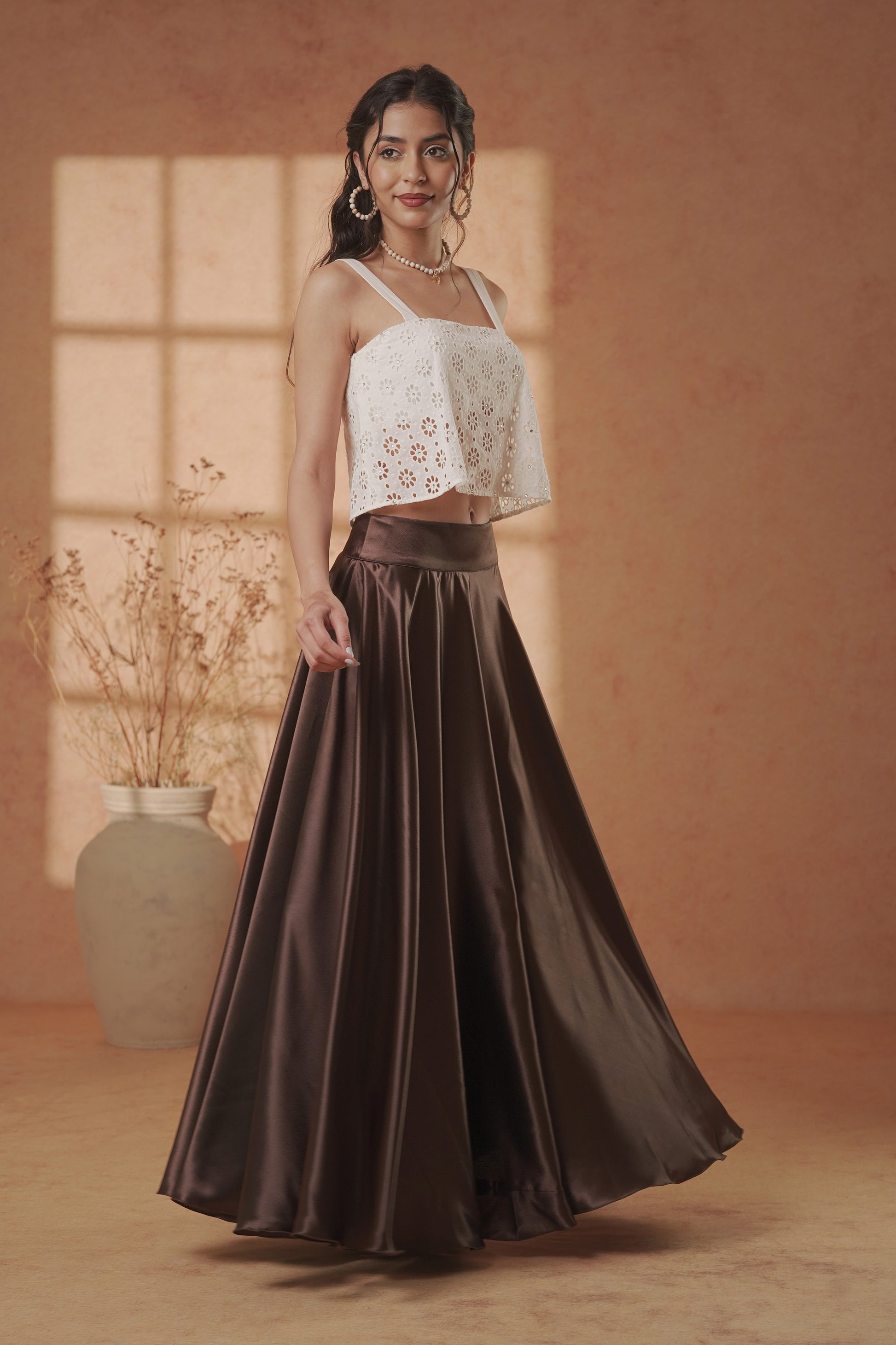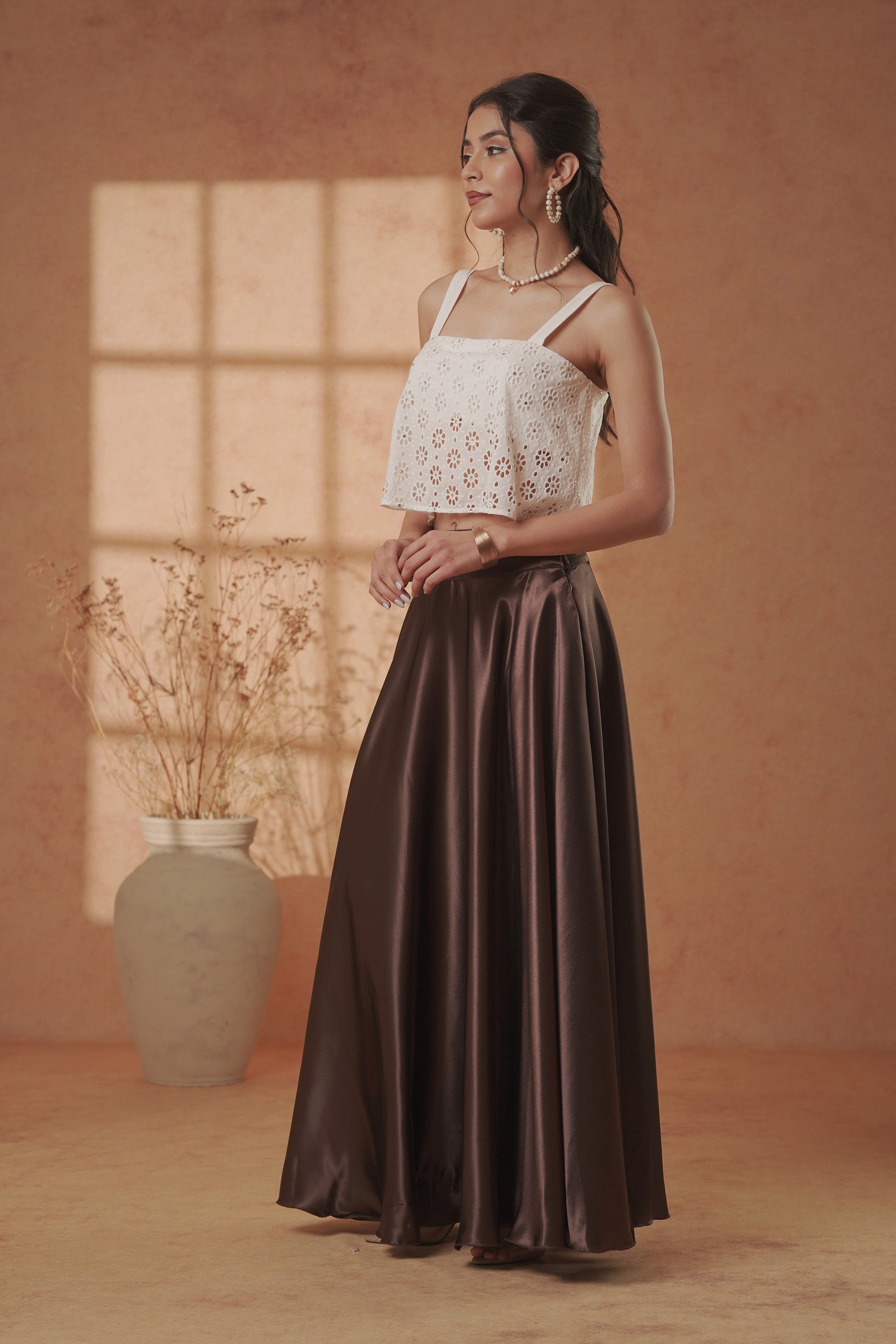 Cocoa Satin Flare Skirt & Ivory Eyelet Crop Top Set