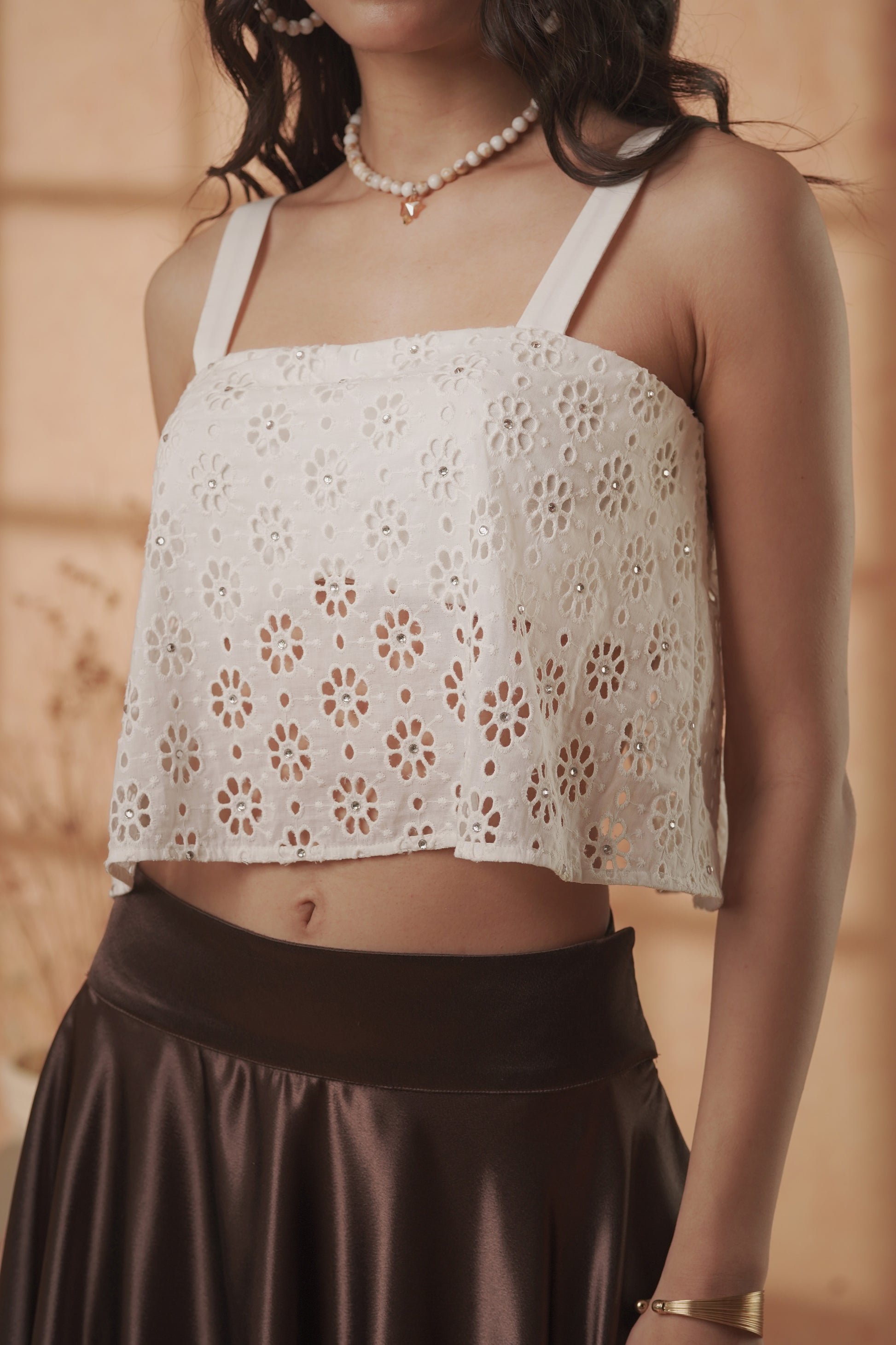 A dreamy fusion-set crafted for celebrations, brunches, and effortless festive dressing. The set features an airy ivory cotton eyelet crop top paired with a luxurious cocoa satin flared skirt. The floral cutwork top adds a delicate, handcrafted charm while the full circular satin skirt moves beautifully with every step. Perfect for modern Indian fusion styling.