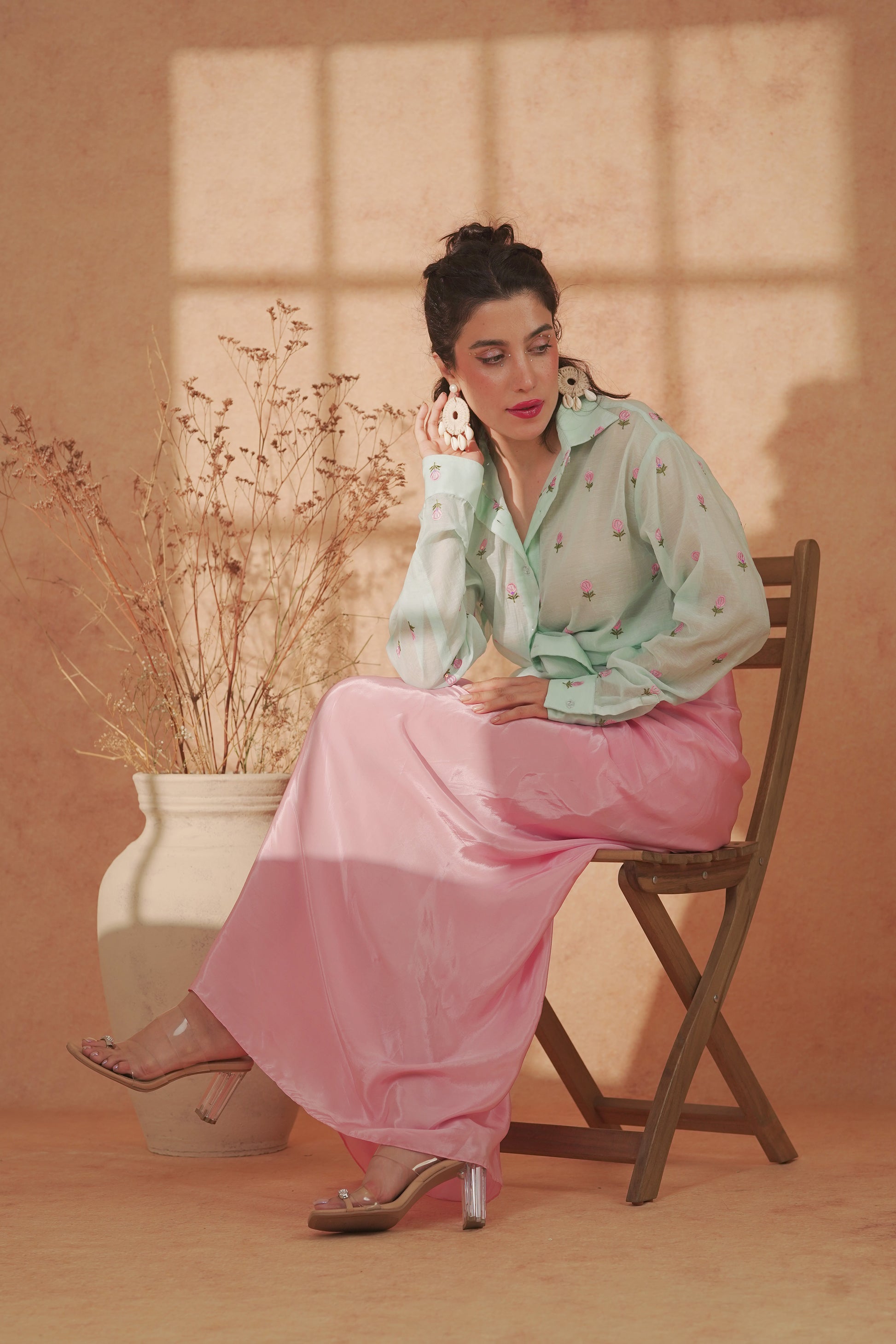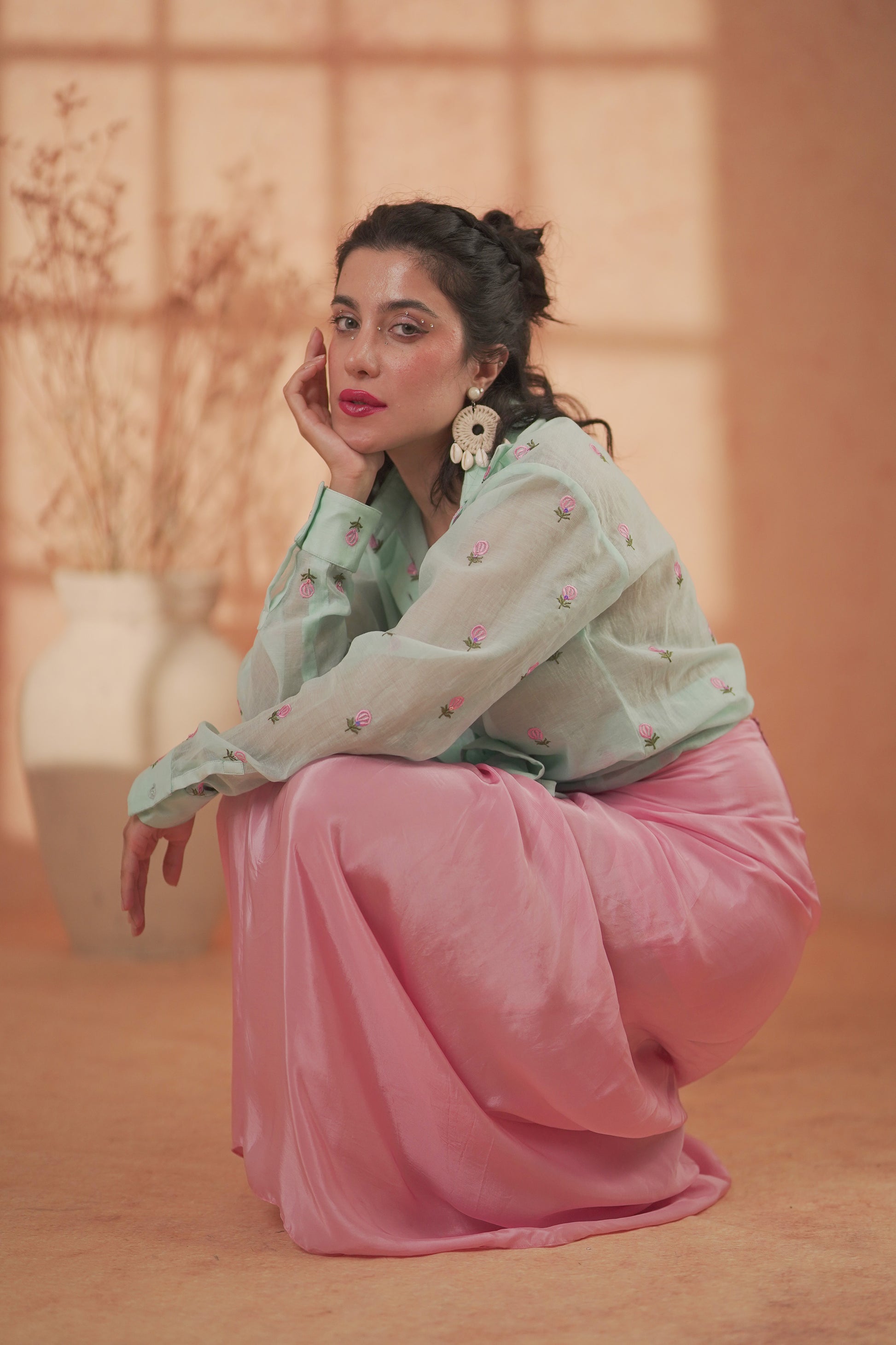 - Shirt: Sky-mint cotton base with Shiny Pink-Green floral embroidery