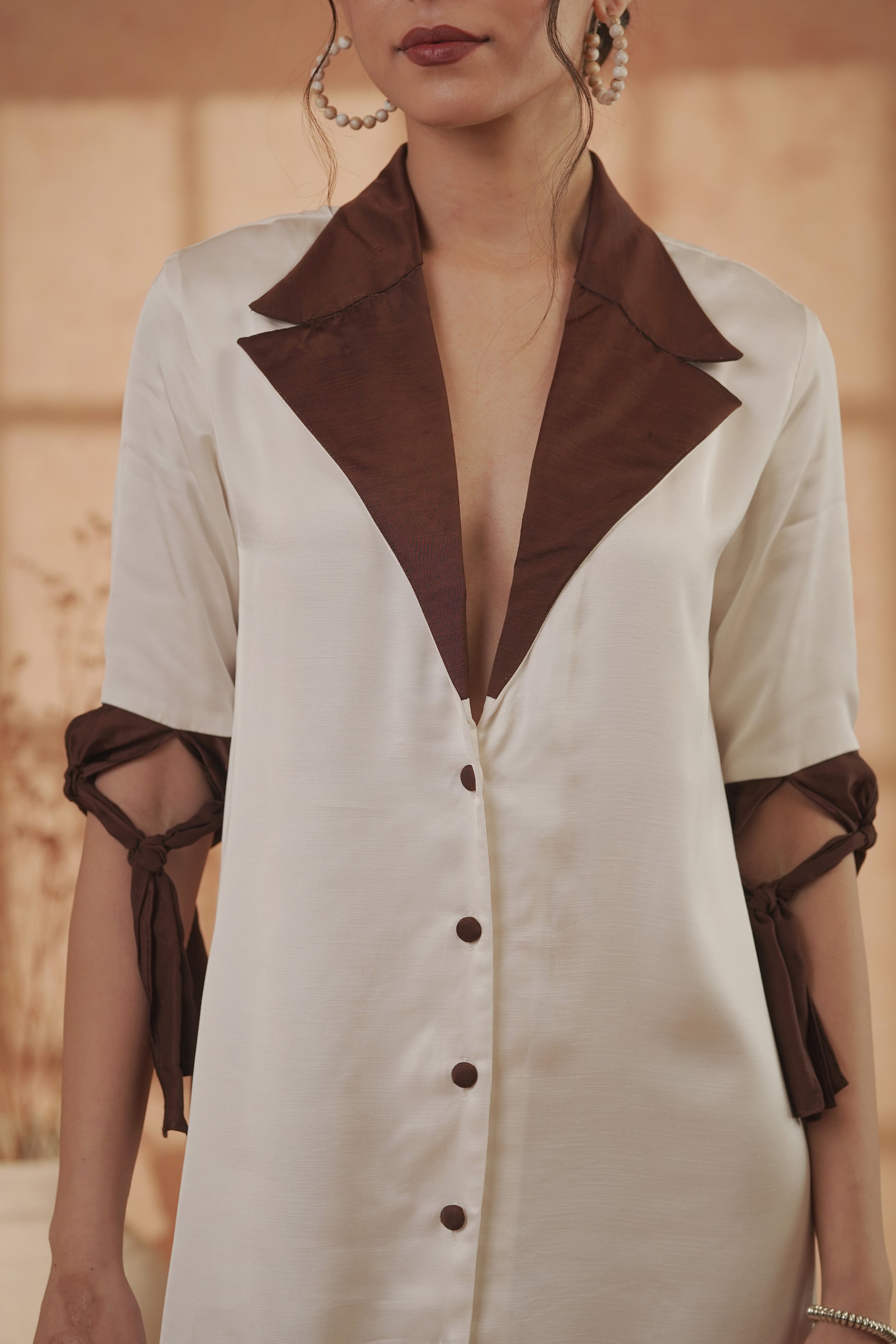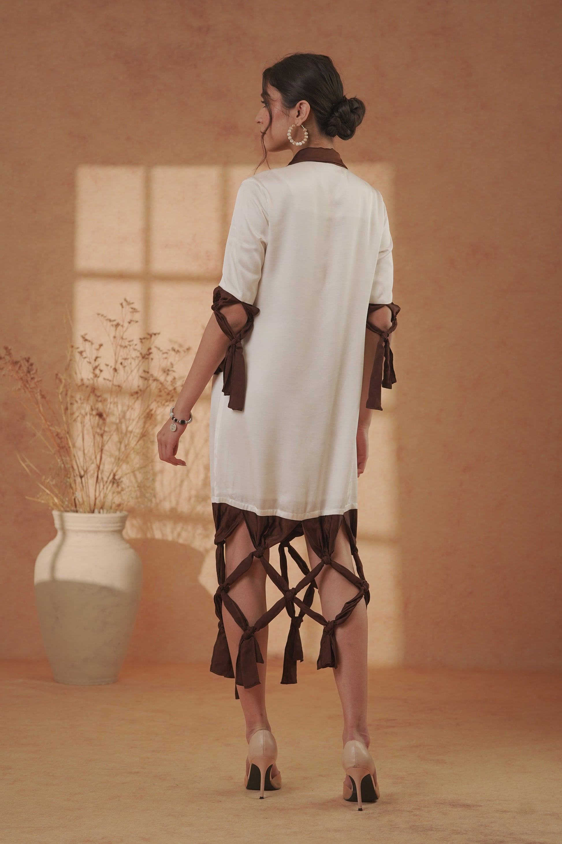 An avant-garde statement piece designed for bold, modern dressing. This white linen-satin shirt dress is elevated with dramatic brown satin knot panels that wrap, weave, and sculpt around the legs—creating a striking, runway-inspired silhouette. The button-down front adds structure, while the fluid knotted drape brings movement and dimension to the outfit.